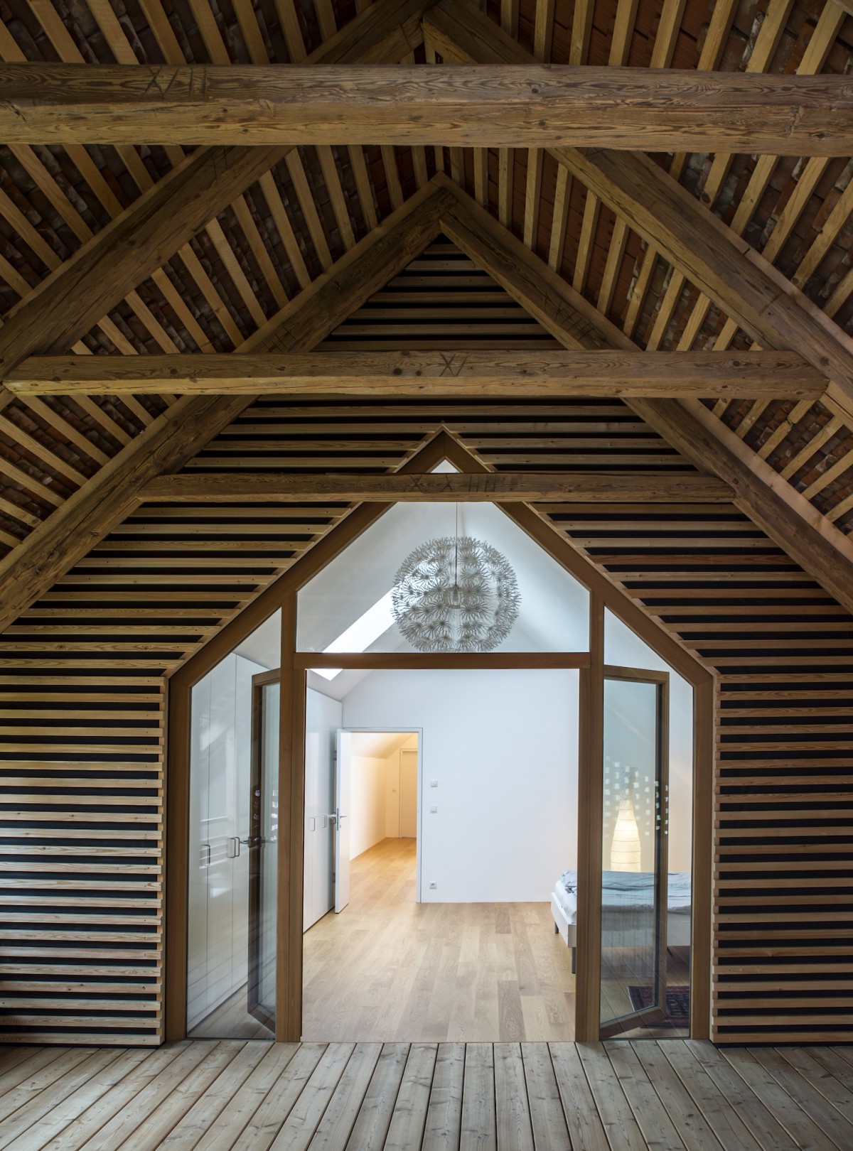 Die bestehende Gebäudestruktur konnte für spannende Raumsequenzen und Freiräume genutzt werden. Im Bereich der ehemaligen Einfahrt für landwirtschaftliche Fahrzeuge wurde ein Anbau geschaffen, der sich mit seinen Raumbegrenzungen aber in der Bestandsstruktur integriert.